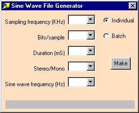 種々のパラメーターで定義されたサイン波ファイルを作ります。バッチ処理が指定された場合には、独立したパラメーターで定義された複数のサイン波ファイルを作ります。